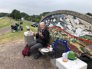 Vandaag een wat langere etappe, 80 km. We moesten een paar rivieren oversteken, en reden we veel over dijken en dijkjes. De eerste rivier was de Lek, die we per pont overstaken bij Culemborg, de tweede was de Linge, waar we koffie dronken bij een picknicktafel. De derde rivier was de Waal, die we bij Brakel overstaken met een pont. De laatste rivier was de Maas bij Veen. Nadat we nog even een terrasje gepakt hadden in Drunen, moesten we nog een kilometer of 20 naar Oisterwijk, waar we pas aan het eind van de middag aankwamen. We kregen een mooi plekje op natuurkampeerterrein 'Morgenrood'. Geen luxe stoelen, maar gewoon onze pop-up stoeltjes, maar die zitten ook best lekker.